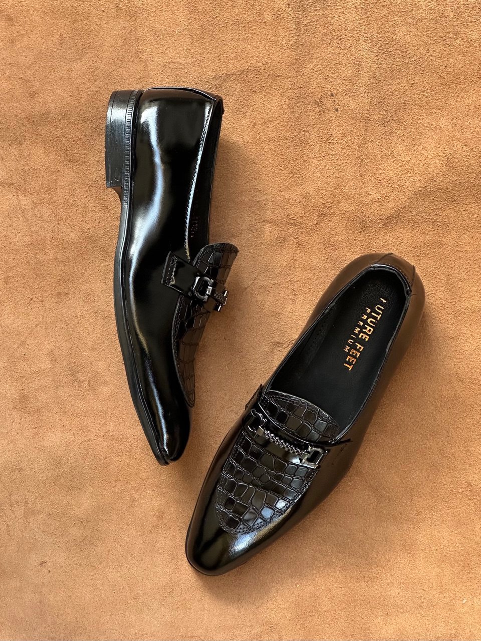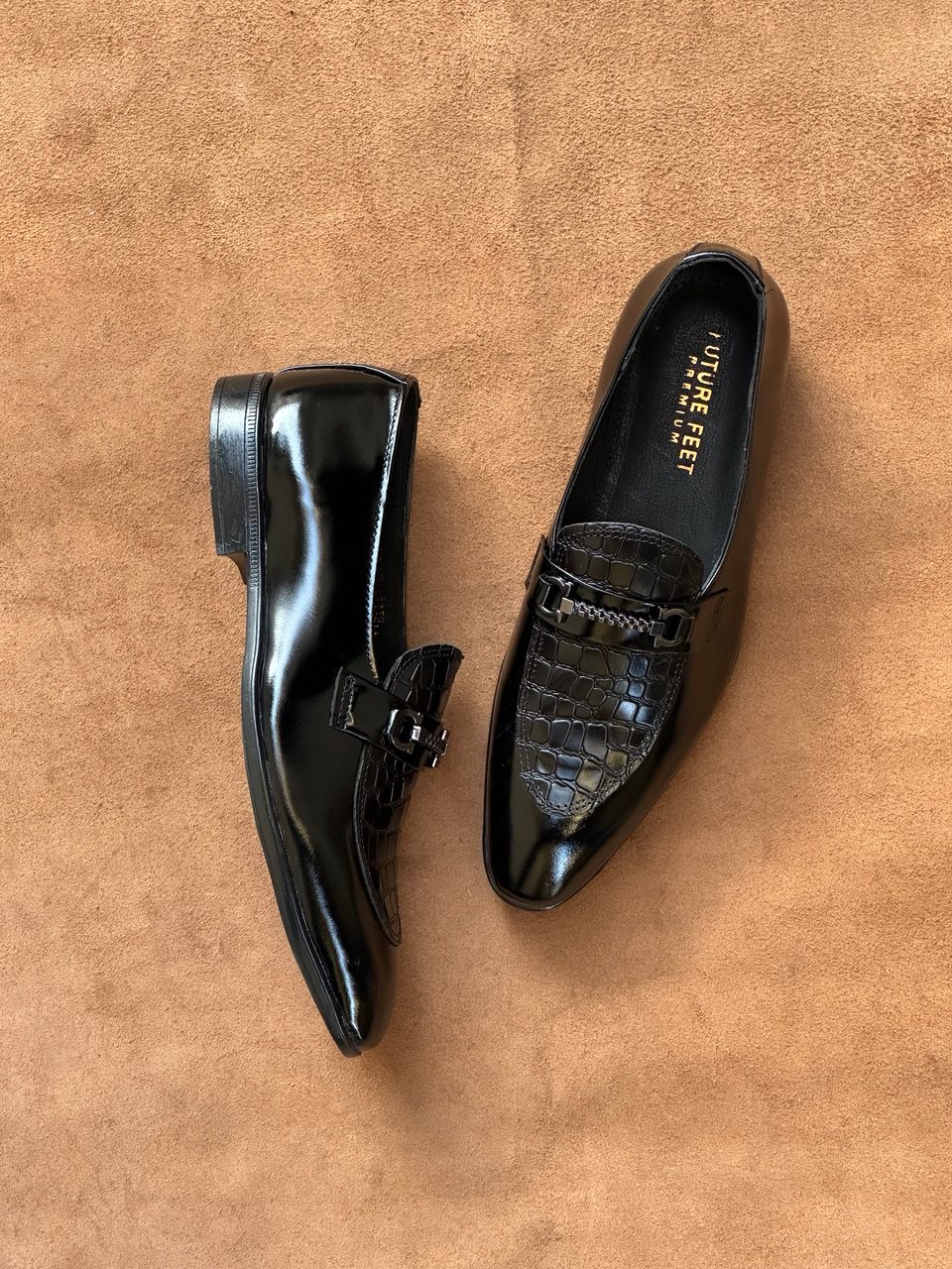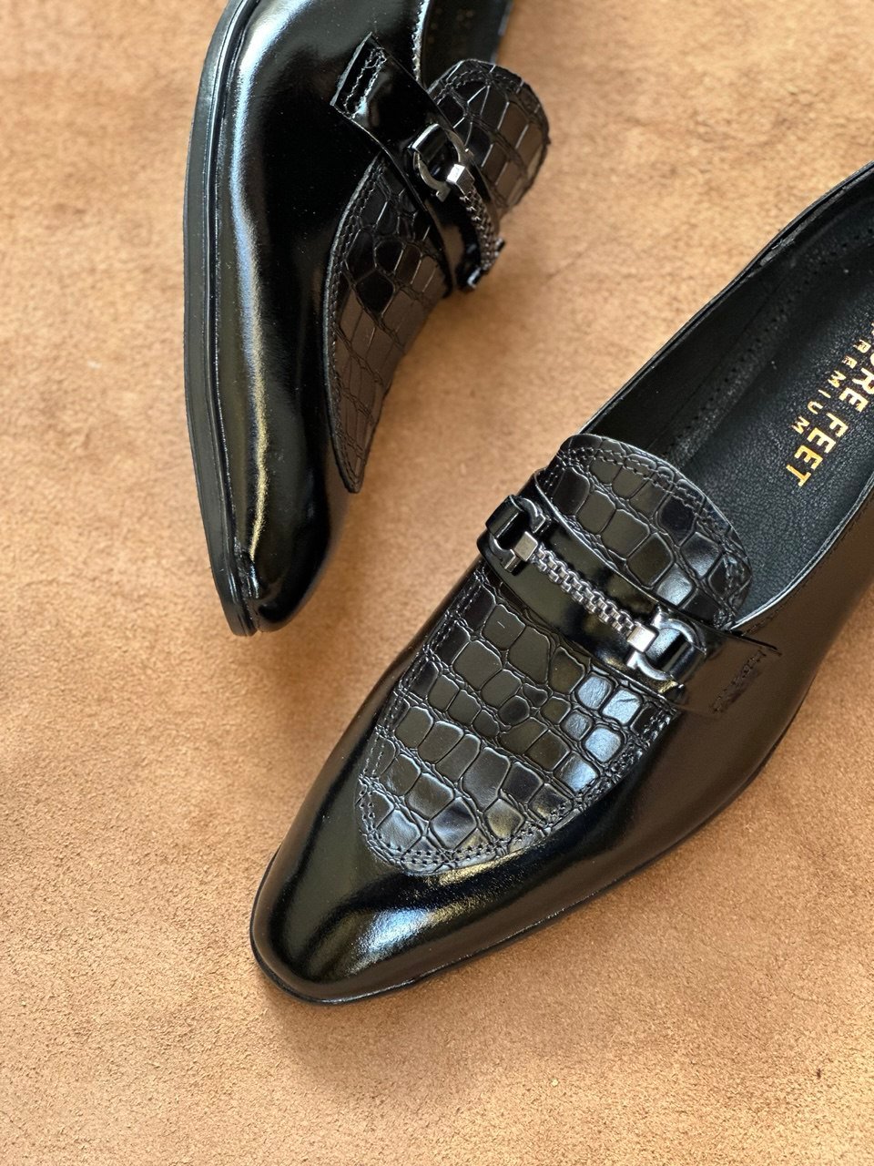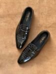 Glossy Black Full Grain Cow Leather Croc Horse-Bit Loafer